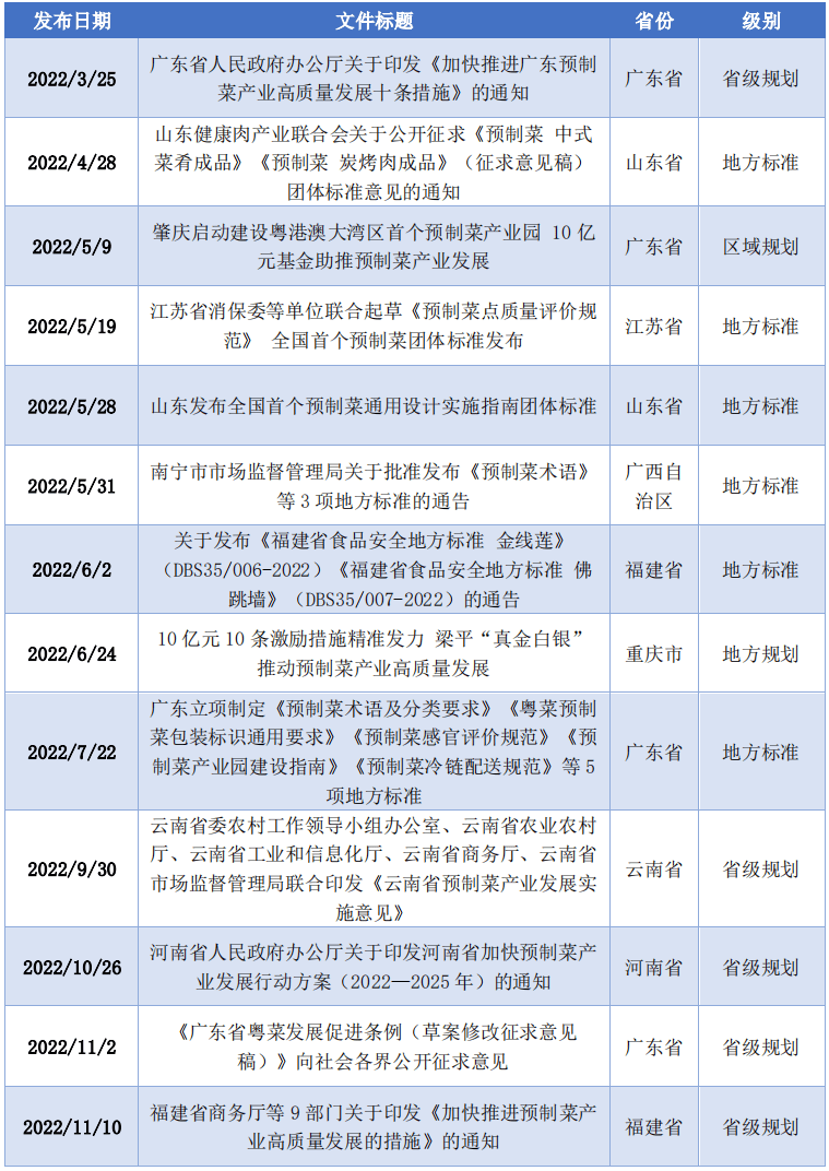 图2-2 中国预制菜行业财产链示企图(图片来自艾媒征询《2022年中国预制菜财产成长》)目前,除了原料供应企业、预制菜专业出产企业、速冻食物企业、连锁餐饮企业和商超零售类企业等行业次要参取者,还有良多企业跨界插手,积极转型结构预制菜范畴,开展相关出产运营。如格力电器、老板电器、海容冷链等企业从预制菜出产制制设备、冷链物流设备等电器出产范畴切入预制菜财产;外卖、商超、生鲜电商等平台也纷纷入局,如饿了么成立特地团队优化细分行业运营,美团买菜、叮咚买菜等电商平台上也将预制菜正在商品分类中单列出来;还有不少看起来取预制菜行业“毫不相关”的企业,则借帮行业成熟的供应链,选择以产物为抓手,间接创立预制菜品牌。如地产巨头碧桂园集团进军预制菜财产,旗下广东碧乡科技成长无限公司推出“食机已道”系列鲟鱼预制菜品;快递行业龙头顺丰也颁布发表推出预制菜行业供应链处理方案,全面结构预制菜。预制菜财产链条长,正在推进农产物深加工、食物制制转型、消费升级、创业就业等方面均具有积极意义,近年来各地部分连续出台政策进行指导、激励和规范。2022年以来,广东、山东、四川、沉庆、福建、浙江、江西、上海、辽宁等多个省市接踵出台预制菜相关财产的政策指点文件,内容次要环绕冷链扶植、企业培育、税收优惠、人才培育、消费补助、品牌打制、财产园扶植和办理等方面。除了政策办法,从地方四处所,预制菜财产相关的尺度规范也连续出台。2022年6月,中国饭馆协会发布《预制菜质量分级及评价》和《预制菜出产质量办理手艺规范》集体尺度,为预制菜的尺度化出产供给了支持;2022年5月,江苏省餐饮办事尺度化手艺委员会、江苏省餐饮协会牵头发布《预制菜点质量评价规范》集体尺度;2022年11月,市场监管局发布预制菜出产运营《落实食物平安从体义务二十条》;2023年1月,上海市市场监视办理局关于发布《上海市预制菜出产许可审查方案》的通知等。