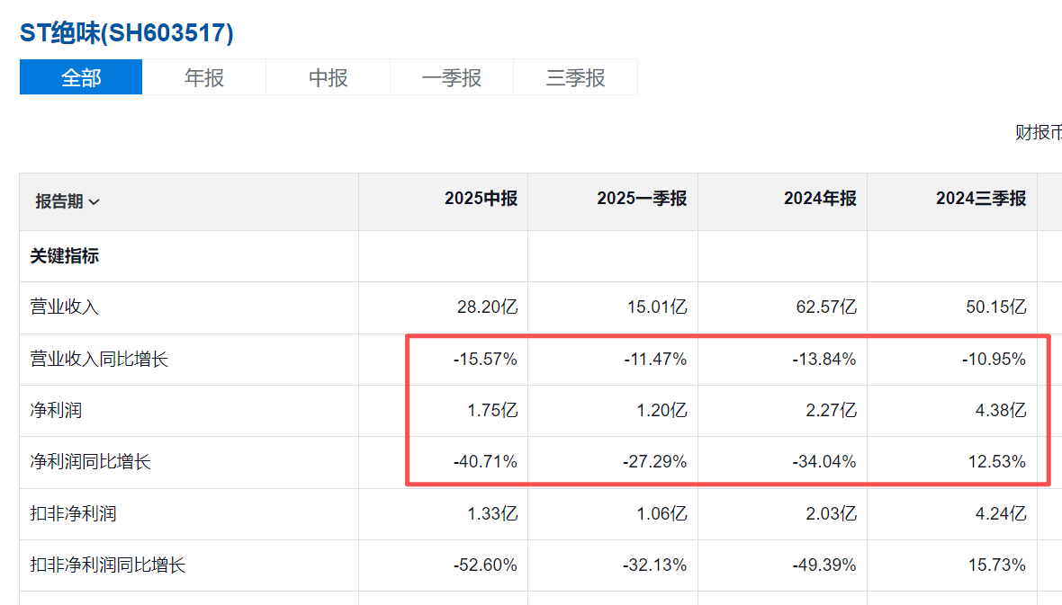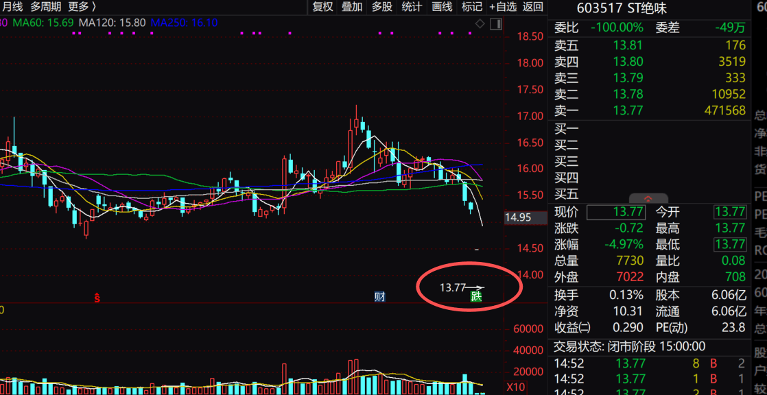 9月24日,绝味食物股份无限公司(下称,绝味食物)开盘即一字跌停。截至当日收盘其股价为13。77元/股,总市值83。45亿元。这是其持续第二个一字跌停板。9月23日,绝味食物被正式“戴帽”ST,股票简称变动为“ST绝味”。
